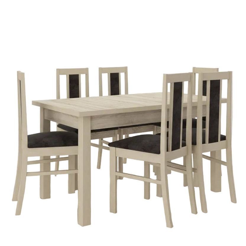Ensemble table extensible 140/180 cm et 6 chaises LES TENDANCES Louiza en bois clair de sonoma et tissu noir