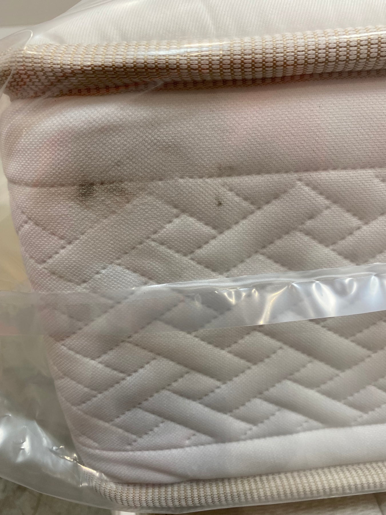 Matelas issu d'un litige transport, jamais utilisé. Il a été reconditionné et désinfecté dans notre atelier de reconditionnement, des taches "propres" restent visibles, uniquement esthétiques car totalement désinfectées (voir photos)