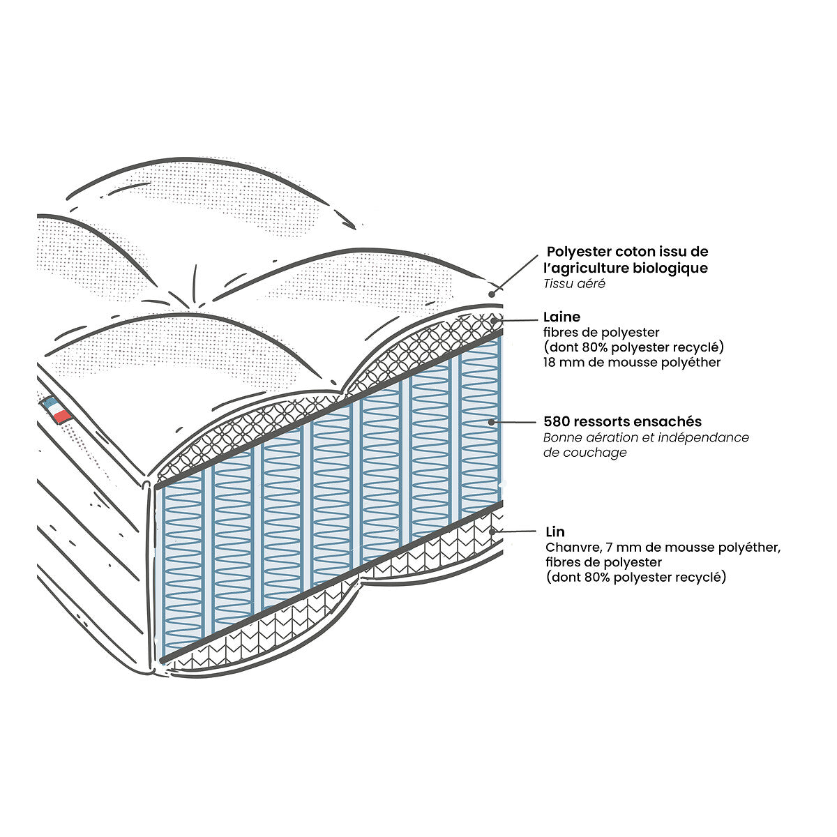 Fabriqué en France, ce matelas s’inscrit dans la gamme Origine, qui marie confort, technologie et matériaux sélectionnés dans une démarche plus responsable.