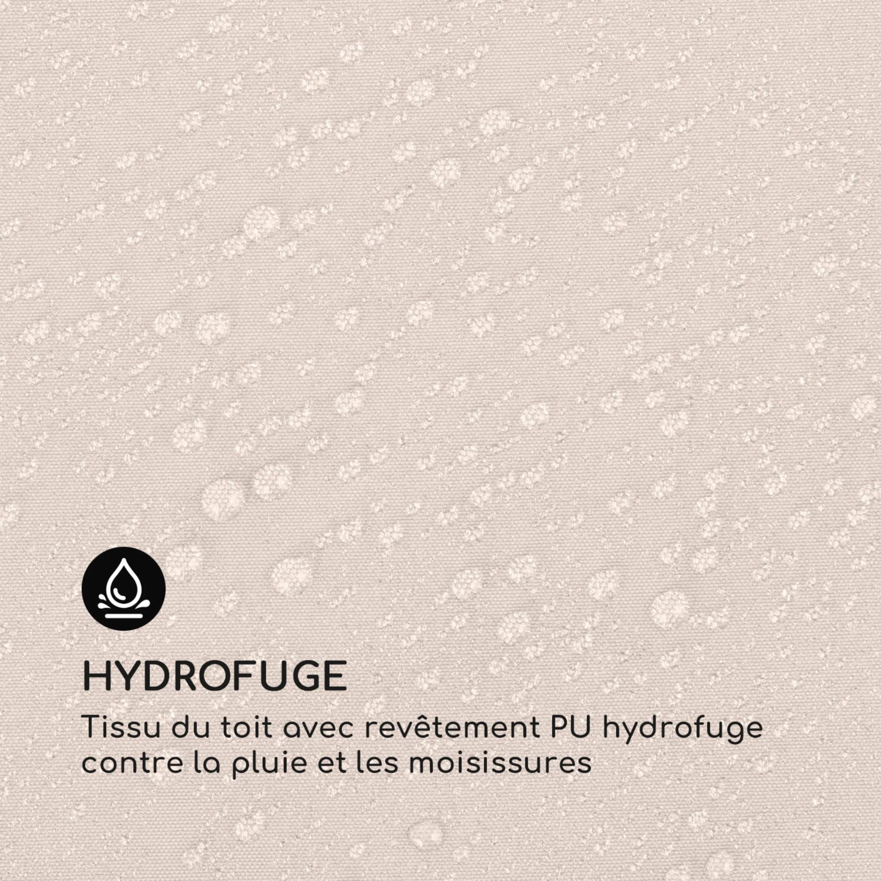 Son auvent en toile polyester 180 g/m² est entièrement enroulable, vous permettant d’ajuster facilement la lumière selon vos envies. Les parois latérales souples en polyester 160 g/m² vous protègent du vent, tandis que le revêtement hydrofuge assure une résistance optimale aux petites averses.