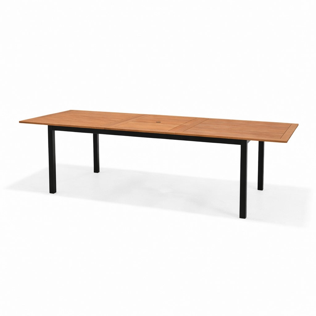 La table séduit par son plateau en eucalyptus certifié FSC®, à la finition huilée chaleureuse, associé à une structure en aluminium résistante et légère. Grâce à sa rallonge intégrée, elle passe facilement de 180 à 240 cm, idéale pour s’adapter à toutes les occasions. La perforation centrale permet d’installer un parasol pour profiter des repas à l’ombre.