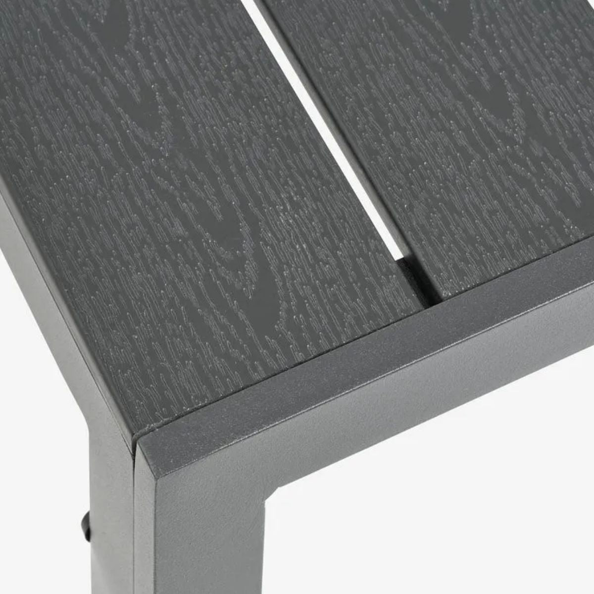Conçue avec un cadre et des pieds en aluminium peint par poudrage, elle offre une excellente résistance aux intempéries tout en restant légère et facile à déplacer. Son plateau en polystyrène imitation bois apporte un rendu chaleureux sans les contraintes d’entretien du bois naturel.