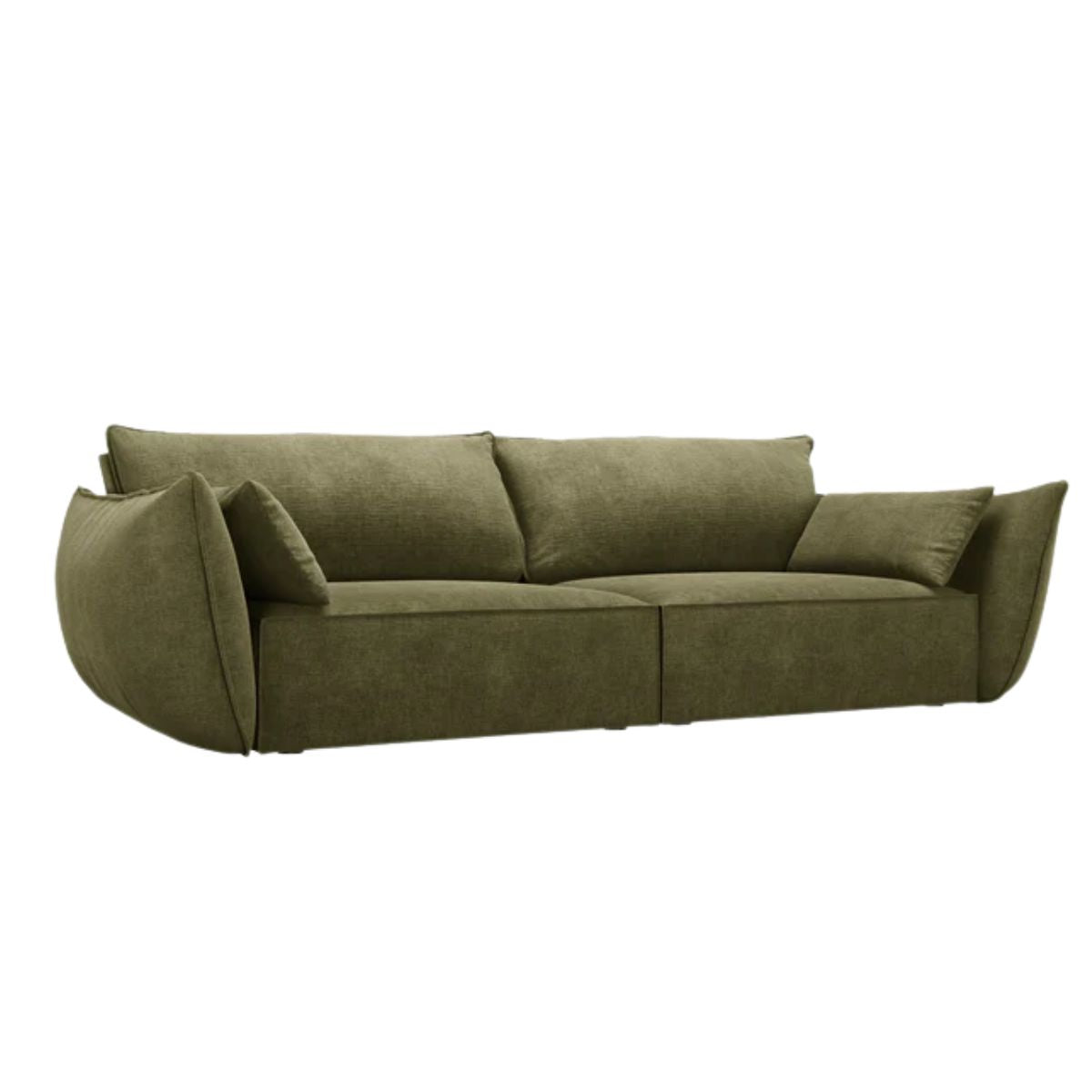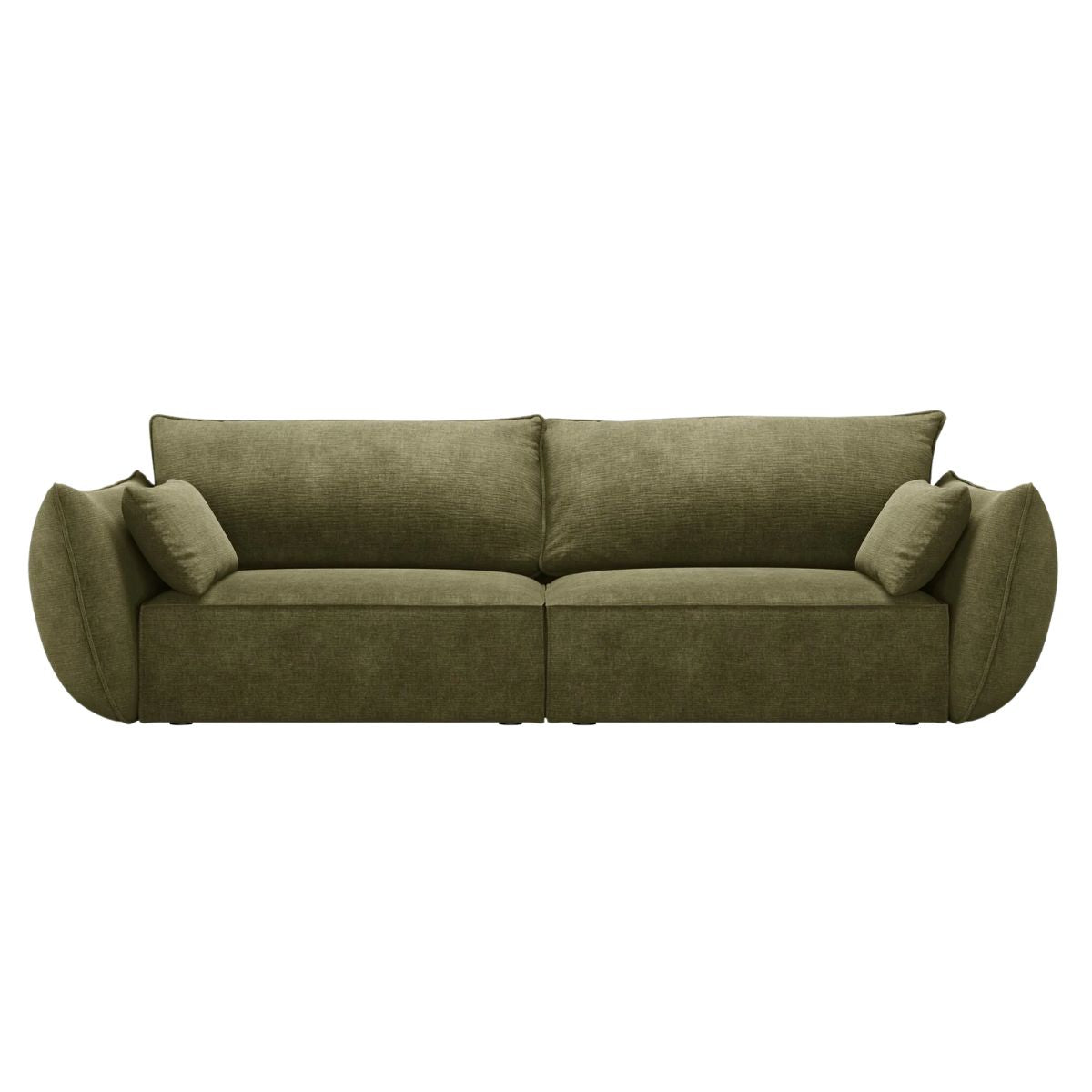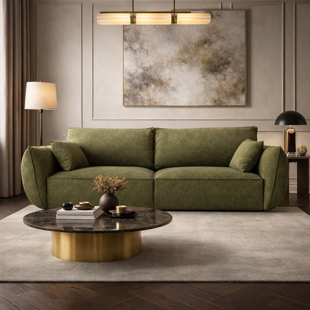 Revêtu d’un tissu chenille vert à la texture veloutée et à l’effet tridimensionnel, le canapé Kaelle est aussi agréable au toucher que résistant. Sa robustesse et la qualité de ses matériaux en font un choix idéal pour un usage quotidien, y compris pour les foyers avec animaux.