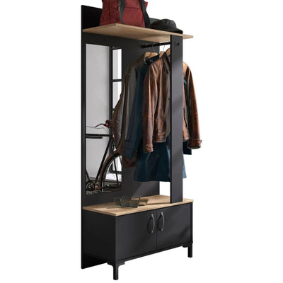 Il comporte une tablette en haut, une penderie, une petite patère, un grand miroir et un espace de rangement fermé derrière les 2 portes battantes : idéal pour ranger les chaussures.