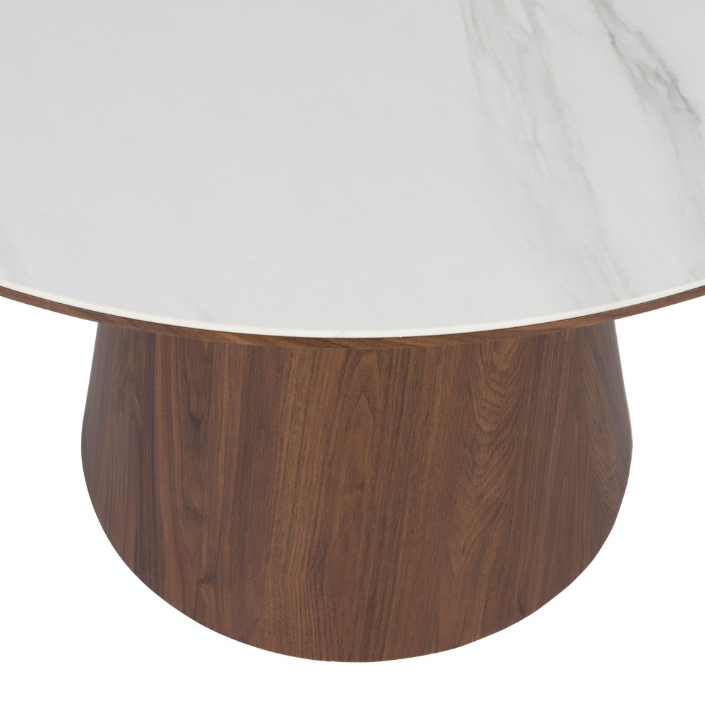 Le piétement en MDF noyer et placage bois foncé crée un contraste chaleureux avec la pierre. Sa silhouette sculpturale apporte sophistication et modernité, tout en assurant une stabilité irréprochable.