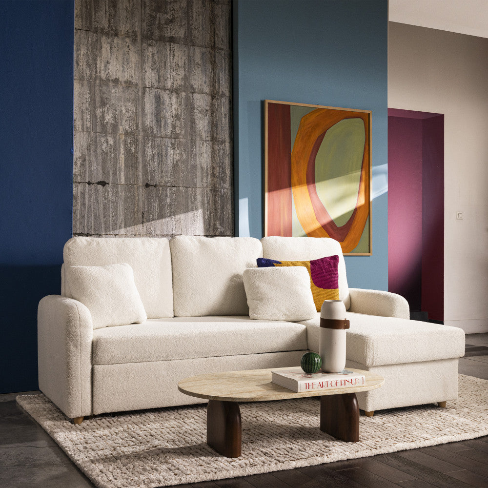 Canapé d'angle réversible convertible DRAWER Matera 3 places en tissu bouclette avec coffre Blanc