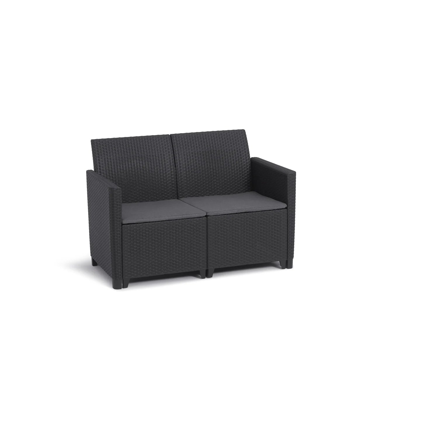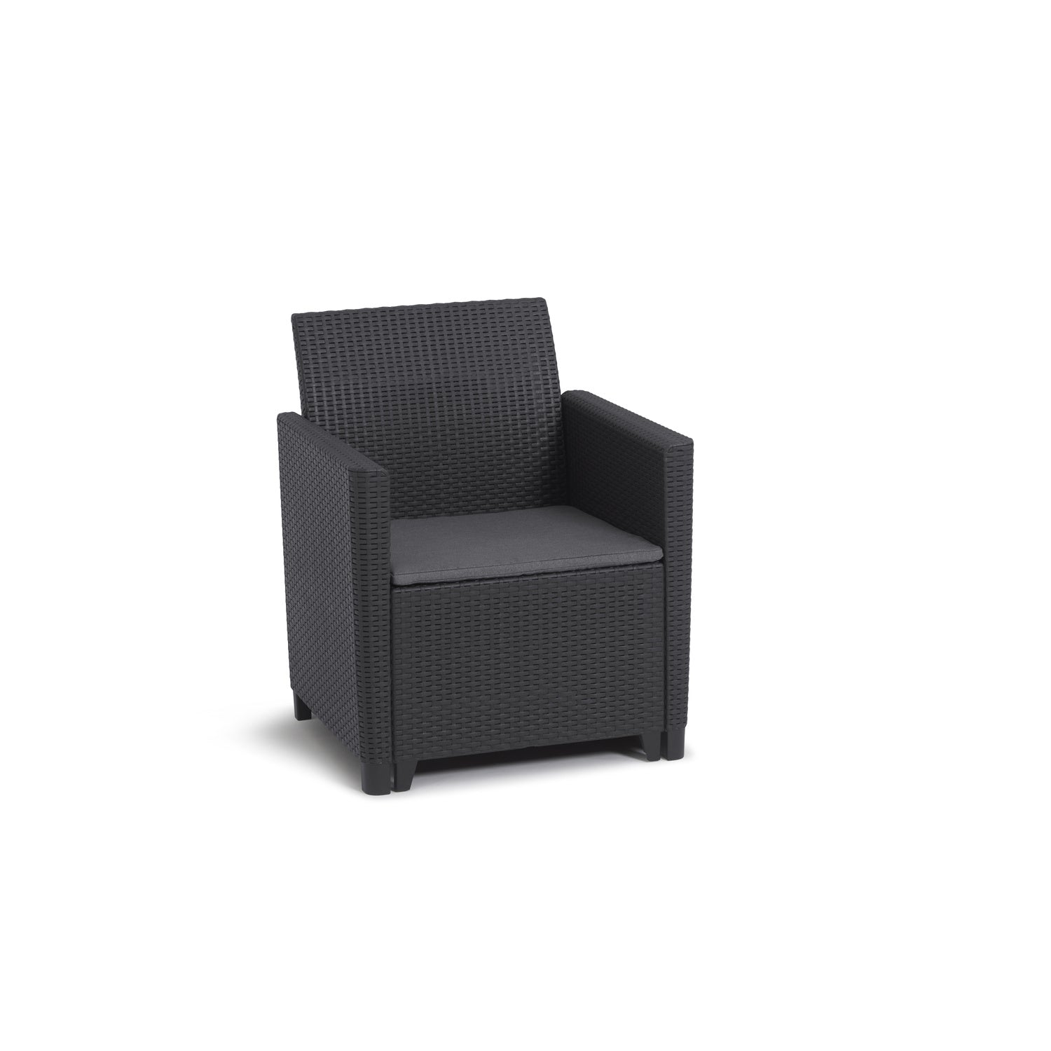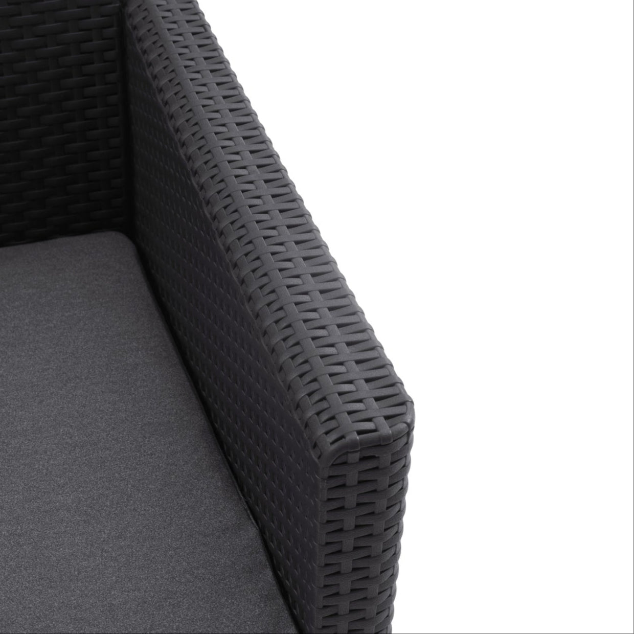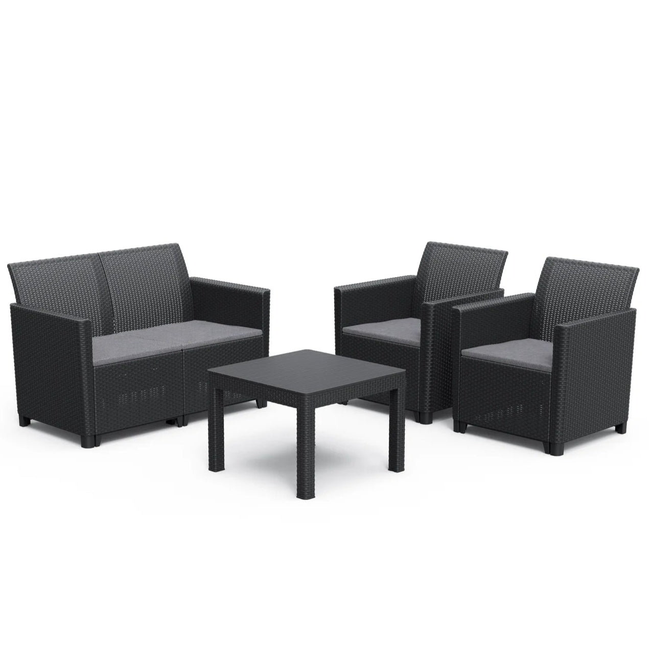 Il comprend un canapé 2 places, deux fauteuils confortables avec coussins d’assise, ainsi qu’une table basse carrée idéale pour vos apéritifs ou pauses café. Léger et résistant, ce salon s’entretient facilement et bénéficie d’un traitement anti-UV pour préserver sa couleur face aux intempéries.