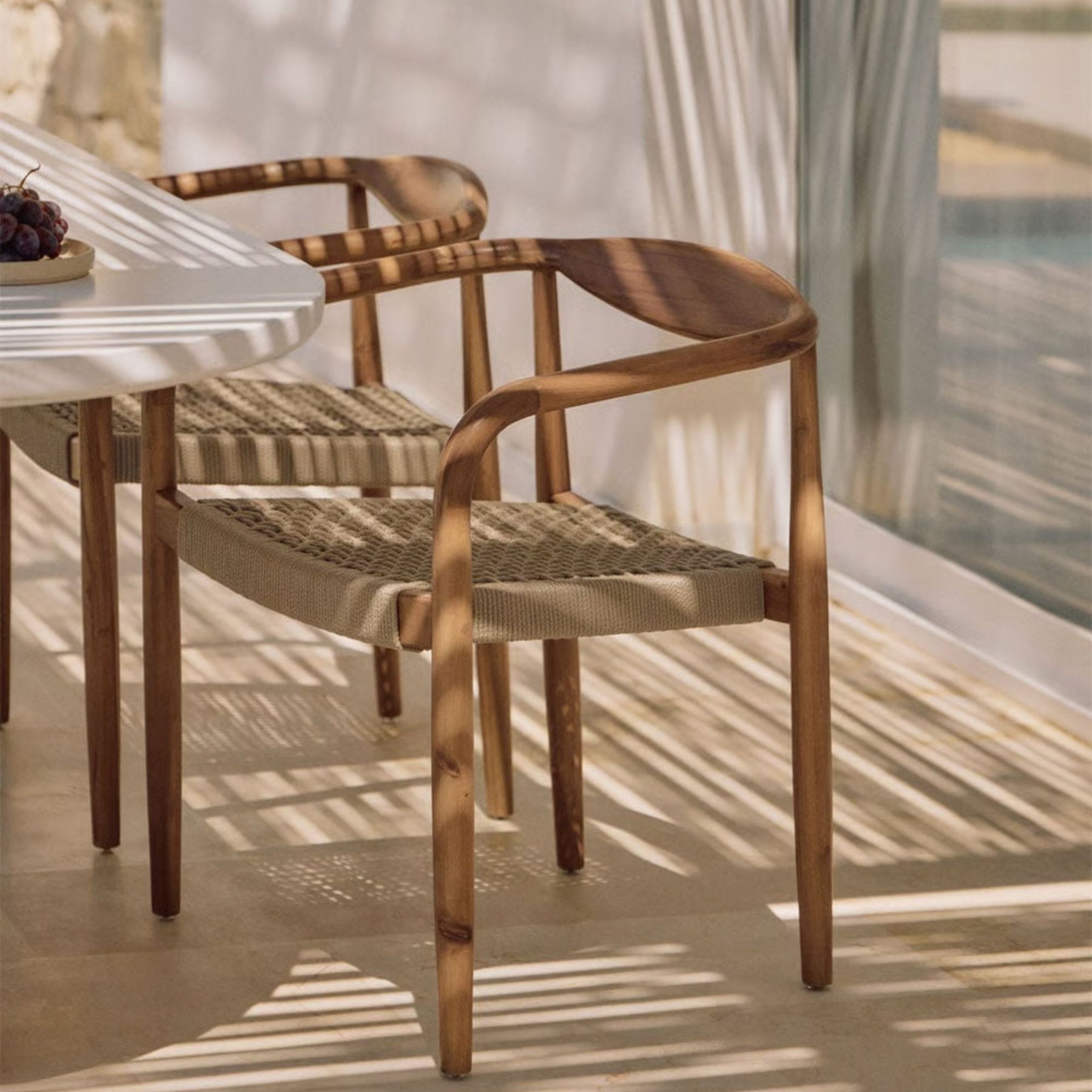 Pensées pour l’extérieur, elles combinent esthétique et robustesse. Le bois d’acacia est reconnu pour sa résistance et sa durabilité, tandis que le tressage en corde polyester assure une assise souple et confortable. Les accoudoirs et le dossier légèrement enveloppant améliorent le confort, rendant ces chaises idéales pour profiter de repas ou de moments de détente en plein air.