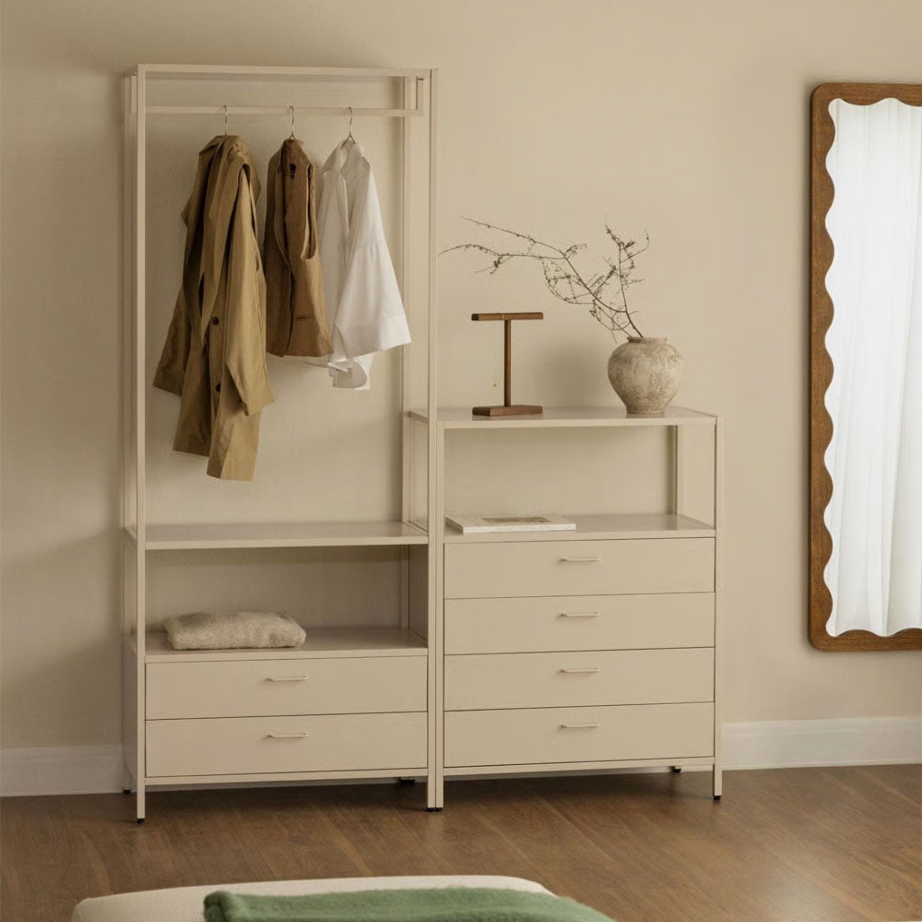 Armoire modulaire ouverte SKLUM Janine 2 pièces avec portant et tiroirs – Beige