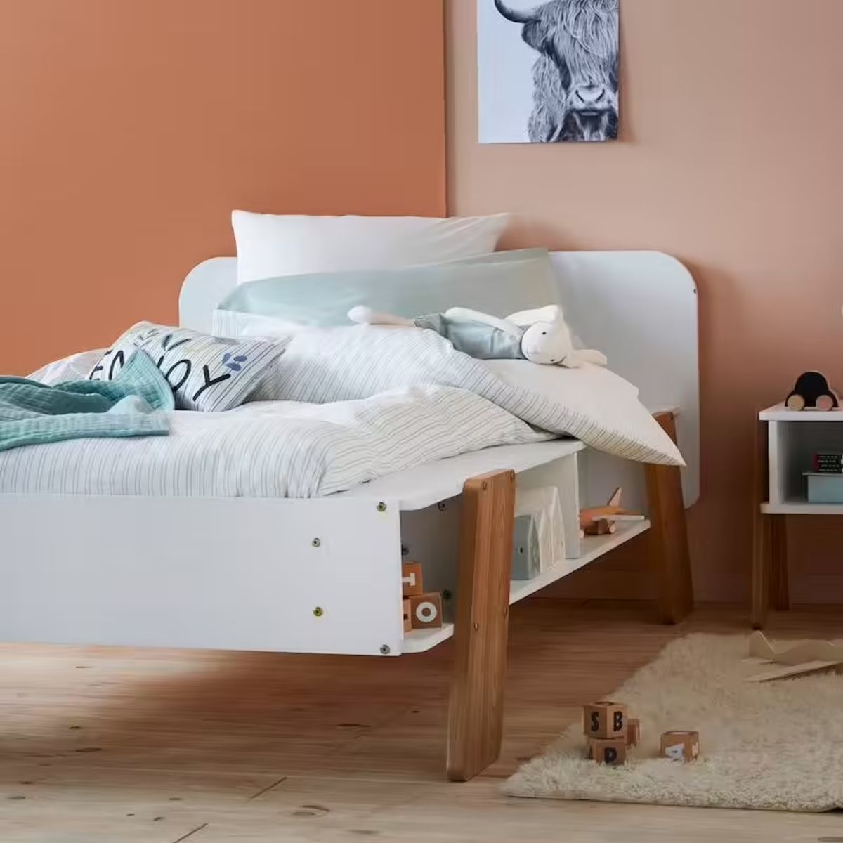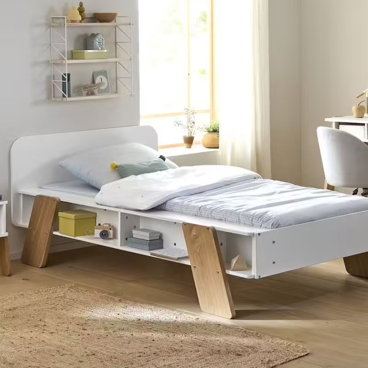 Son association de blanc lumineux et de bois naturel apporte une touche moderne et chaleureuse, parfaitement adaptée à une chambre d’enfant ou de préadolescent.