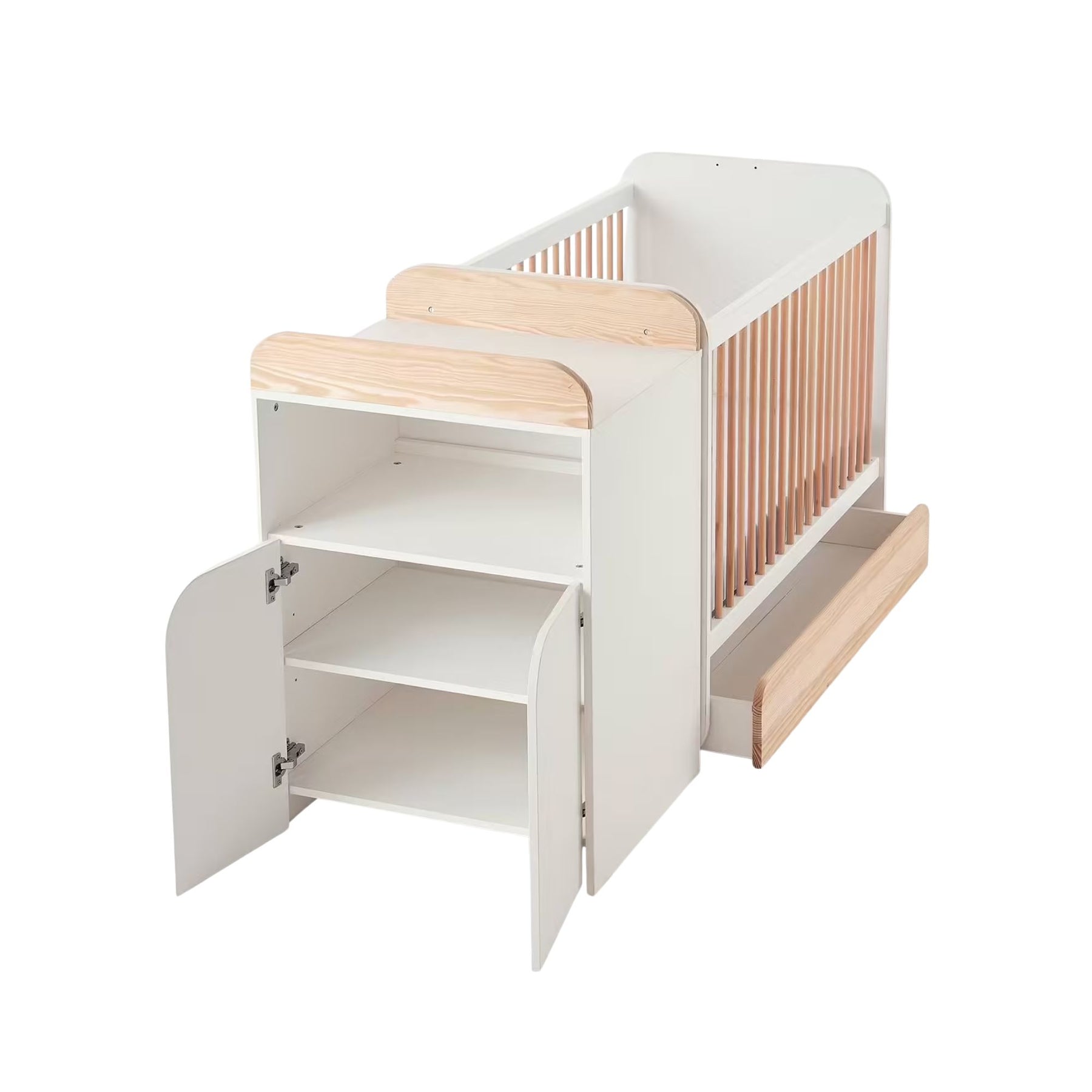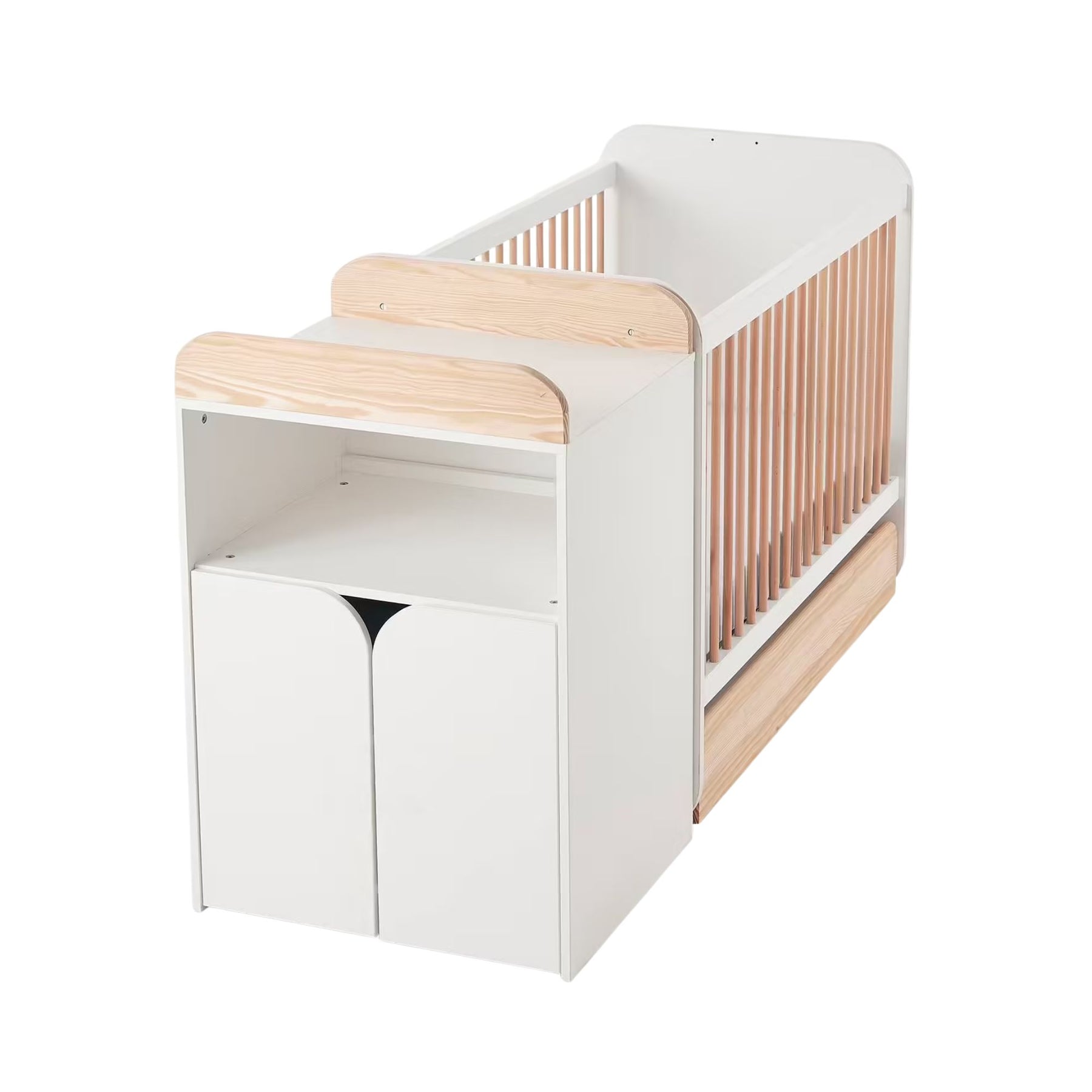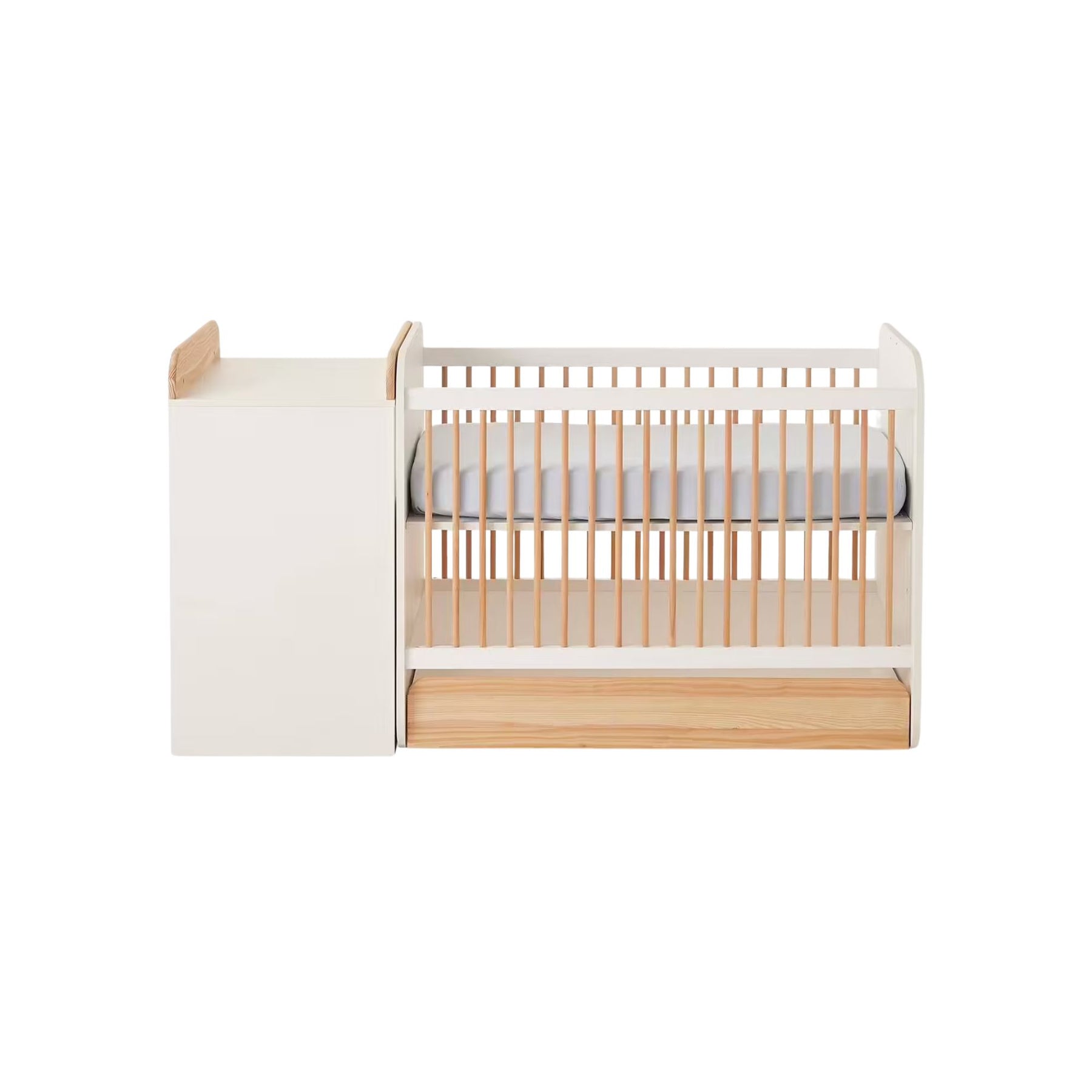 Type : Lit bébé évolutif combiné 2 en 1 (lit bébé + rangement → lit enfant + rangement)