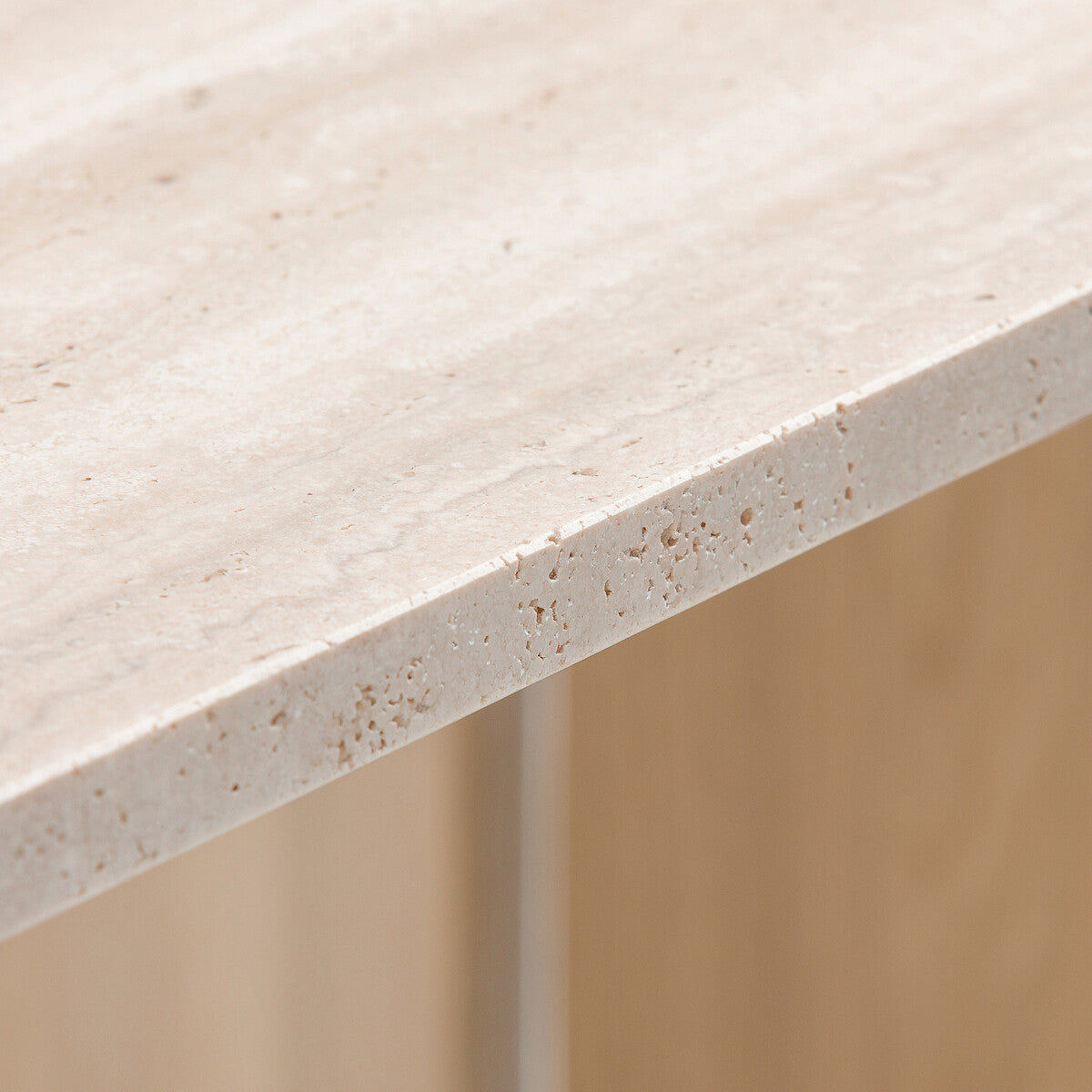 • Plateau en pierre travertin Romano, provenant d'Italie, aux pores rebouchés avec de la résine transparente. Bords bruts et chants émoussés. Chaque pièce est unique.